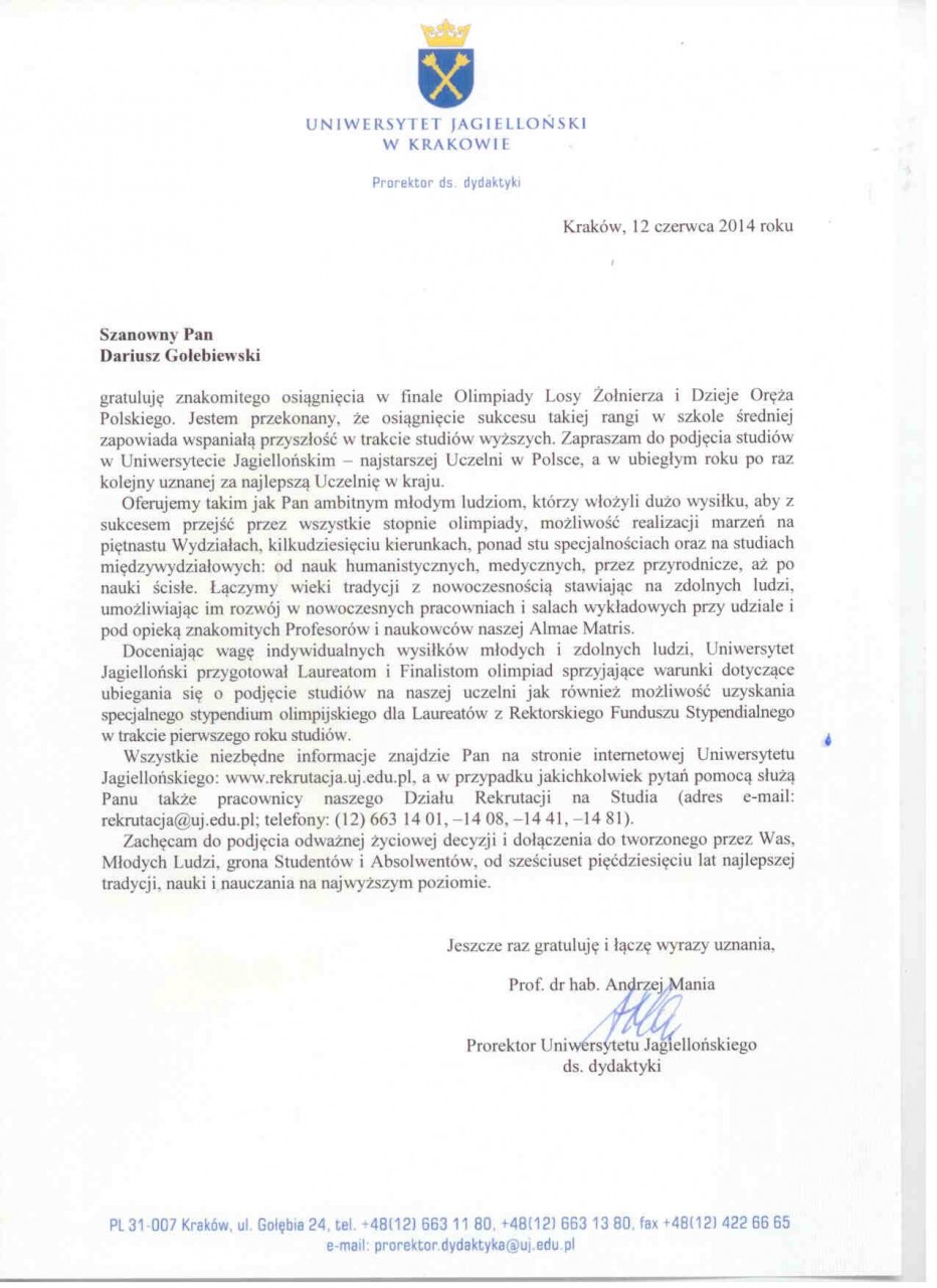 Wielkie wyróżnienie otrzymał Dariusz Gołębiewski z klasy I B. Znalazł się w finale Ogólnopolskiej Olimpiady Losy Żołnierza i Dzieje Oręża Polskiego, której eliminacje centralne odbyły się na początku czerwca w Warszawie. W ślad za tym sukcesem do szkoły przyszedł list gratulacyjny od Prorektora Uniwersytetu Jagiellońskiego, profesora Andrzeja Mania, w którym, oprócz serdecznych wyrazów podziwu dla zainteresowań i osiągnięć naszego licealisty, który już w pierwszej klasie osiągnął taki wynik – znalazły się konkretne oferty związane z podjęciem studiów na krakowskiej renomowanej uczelni. Darek, jeśli wybierze edukację na Uniwersytecie Jagiellońskim – będzie mógł liczyć na specjalny program stypendialny i szczególną opiekę, którą władze uczelni otaczają Finalistów i Laureatów olimpiad.