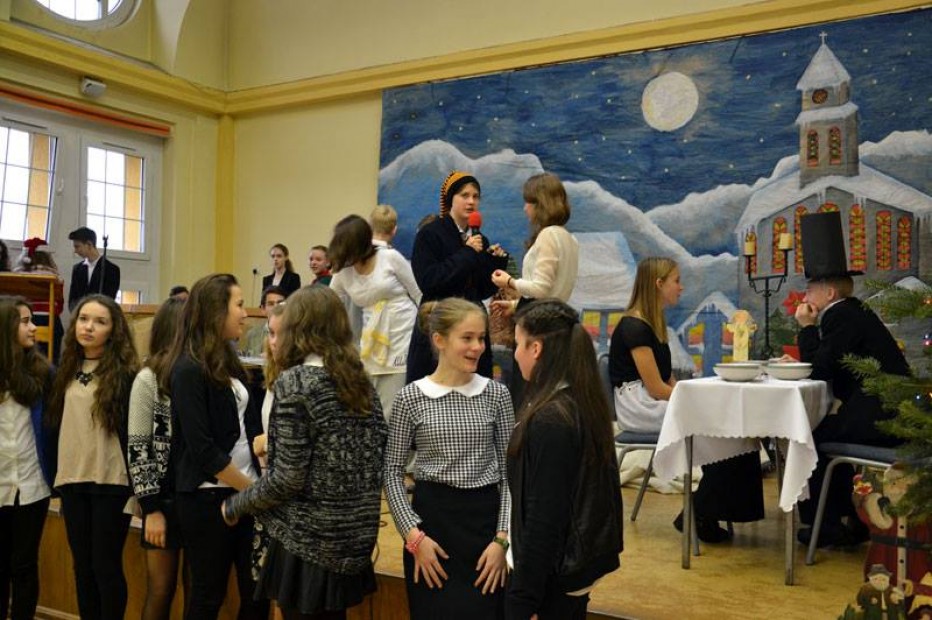 Ostatni dzień szkoły 2014 roku spędziliśmy w przepięknej scenografii przygotowanej przez klasę I a Liceum oglądając „Opowieść Wigilijną” – spektakl przygotowany przez I i II klasę I Prywatnego Gimnazjum.