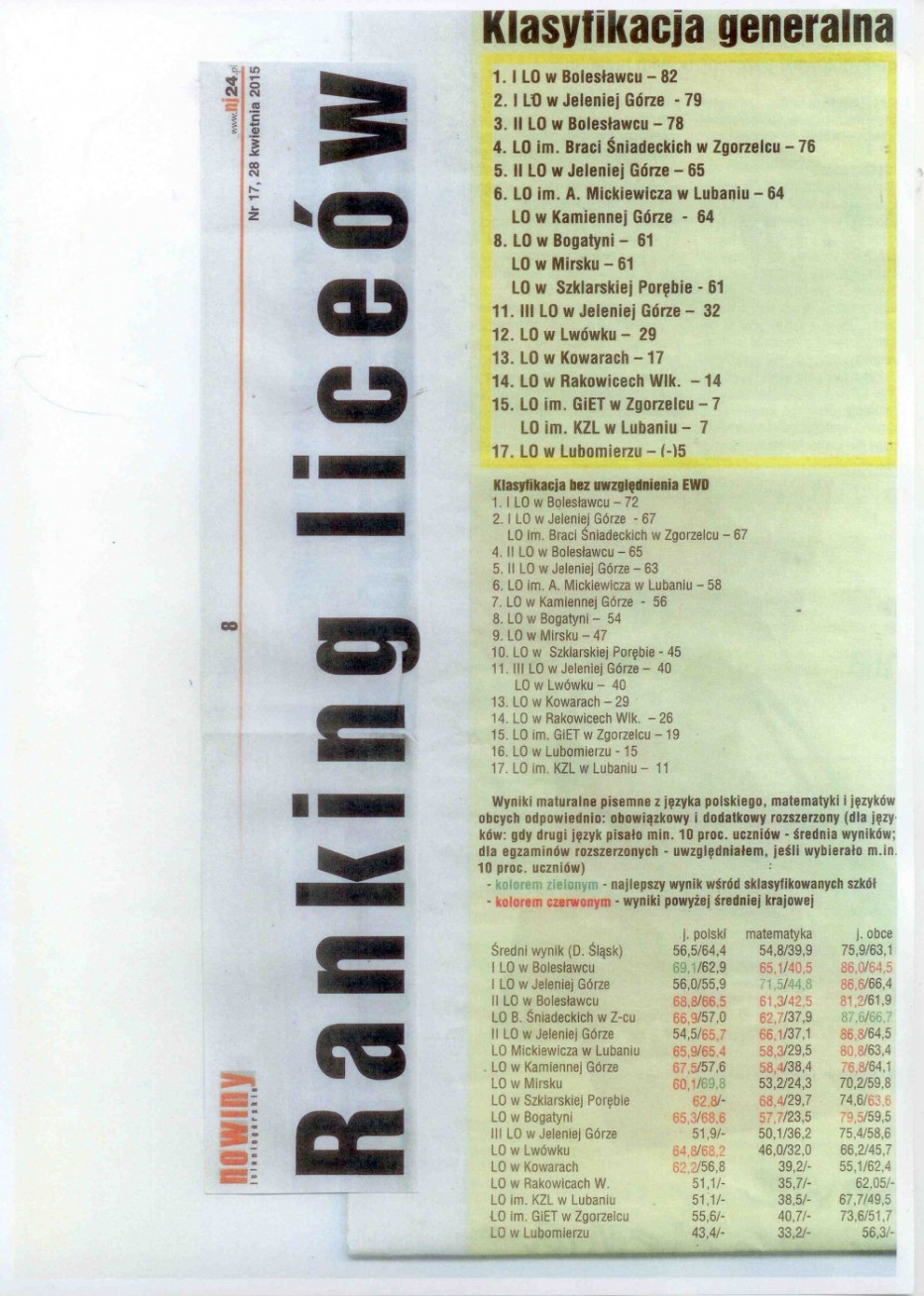 Opublikowany dziś Ranking Liceów gazety 'Nowiny Jeleniogórskie” przyniósł nam dużą satysfakcję. Ponownie znaleźliśmy się na I miejscu wśród szkół dawnego województwa!