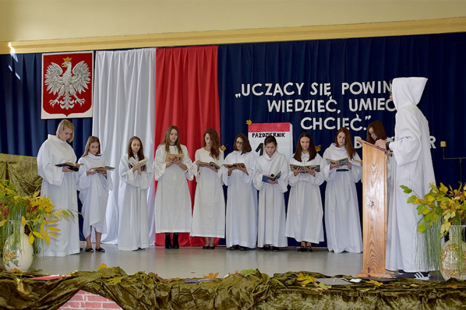 Uroczystość z okazji Dnia Edukacji Narodowej, która odbyła się w szkole 13 października miała podniosły, a zarazem radosny nastrój. To czas, w którym przychodzi szczególny moment na podziękowania, gratulacje, ale także refleksję o edukacji, jej historii i tych wszystkich, którzy ją tworzyli i tworzą. Temu poświęcone było wystąpienie Dyrektora Cezarego Czernatowicza oraz część artystyczna, przygotowana przez klasę I B. Nie zabrakło też odniesień do naszej szkolnej rzeczywistości, do wspomnień o nauczycielach i pracownikach, którzy odeszli. Przywołana została postać Pana Dariusza Kwaśniewskiego, Starosty Bolesławieckiego, przyjaciela młodzieży i naszego Liceum.