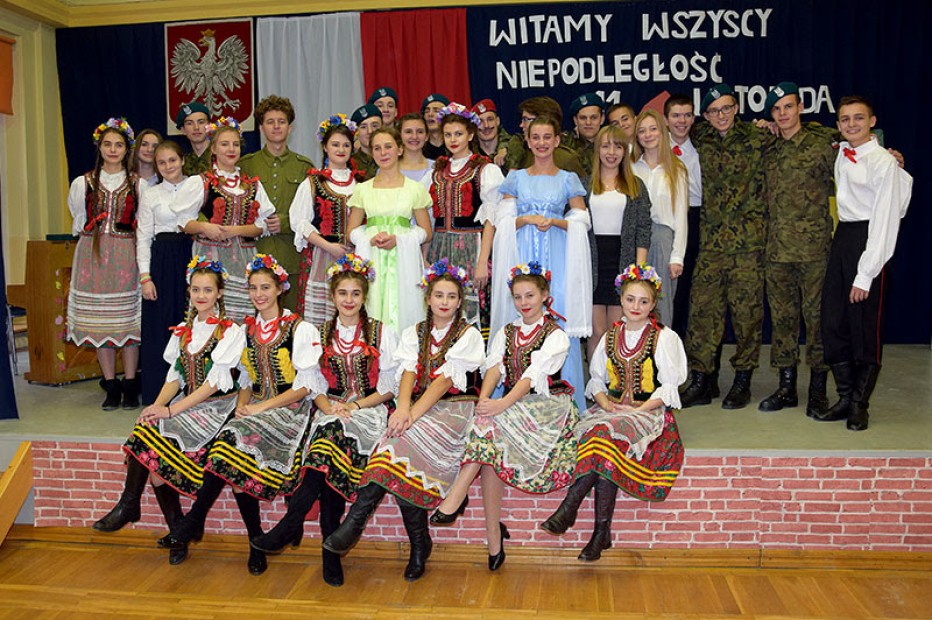 Dziewczęta ubrane w ludowe stroje. Na scenie mieniły się kolorami kwieciste, krakowskie spódnice, serdaki i białe koszule oraz dolnośląskie, długie suknie. Chłopcy wyglądali bardzo dojrzale w strojach żołnierskich i ułańskich.