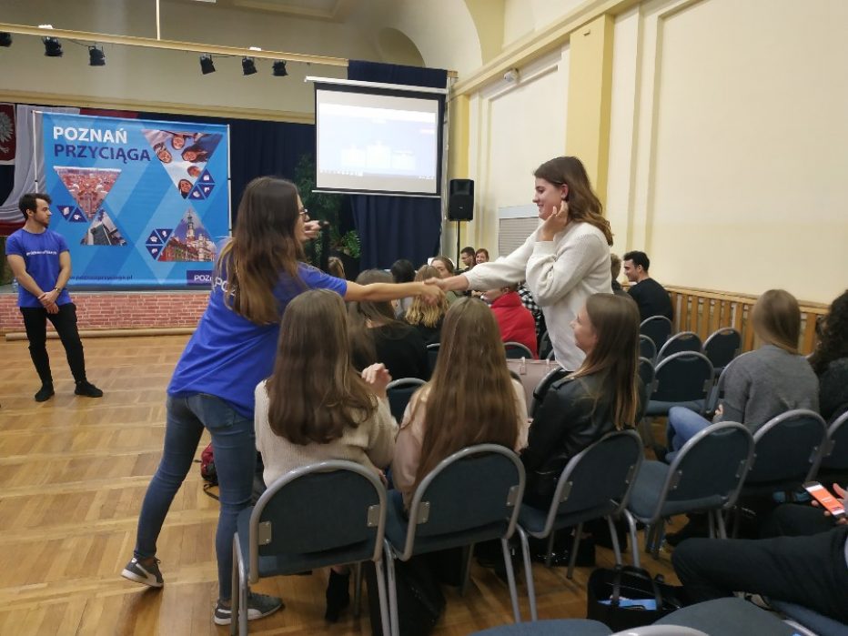 W ramach cyklu promocji kierunków studiów i dalszej edukacji w piątek, 19 października zainteresowani uczniowie klas III spotkali się z przedstawicielami poznańskich szkół wyższych. Zgodnie z tematem „Poznań przyciąga” prowadzący zaprezentowali zarówno uczelnie publiczne, jak i prywatne. Poza tym opowiedzieli o możliwościach dotyczących zamieszkania podczas studiów, poruszania się po mieście komunikacją miejską (w tym rowerami, których stacji w mieście znajduje się aż 113), punktach gastronomicznych oraz atrakcjach kulturalnych w Poznaniu. Studenci mówili również o rynku pracy oraz pomocy, jaką można uzyskać od uczelni w zakresie znalezienia pracy. Wspomniano także o korzyściach, z jakimi wiąże się wyjazd w ramach programu Erasmus.