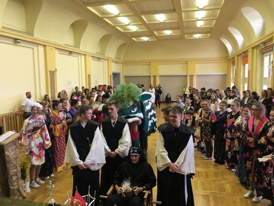 Tradycyjnie w naszej szkole odbył się Dzień Pierwszoklasisty (28 września), którego celem jest zarówno oficjalne przyjęcie uczniów klas I, jak też wspólna zabawa i integracja. Tym razem klasa III F, która organizowała to wydarzenie, zaproponowała ciekawą konwencję, tematem której były mitologie. I tak mogliśmy podziwiać klasę I A – w wersji rzymskich bogów, I B – egipskich, I C – japońskich oraz I E – nordyckich. Trzeba przyznać,że wszyscy stanęli na wysokości zadania i każda z klas wykazała się dużą inwencją i pomysłowością zarówno w strojach, jak tez przygotowanych symbolicznych prezentach dla jury. Klasom dzielnie kibicowali wychowawcy: p. Marcin Sobczyszyn, p. Alicja Kozioł, p. Dorota Startek i p. Barbara Opar.