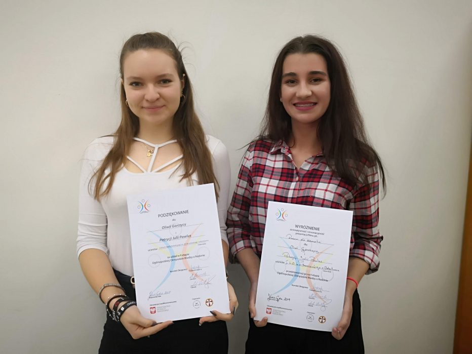 Nasze licealistki: Patrycja Pawlus (z kl. II c) i Oliwia Gorczyca (z kl. II a) zwyciężyły w eliminacjach okręgowych Ogólnopolskiej Olimpiady Wiedzy o Rodzinie. Dziewczęta przygotowywały się pod kierunkiem pani Beaty Majewskiej. Teraz czekają na decyzję Komitetu Centralnego o zakwalifikowaniu się do ogólnopolskiego etapu.