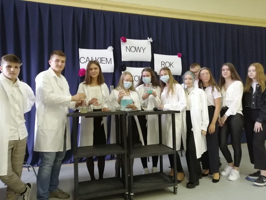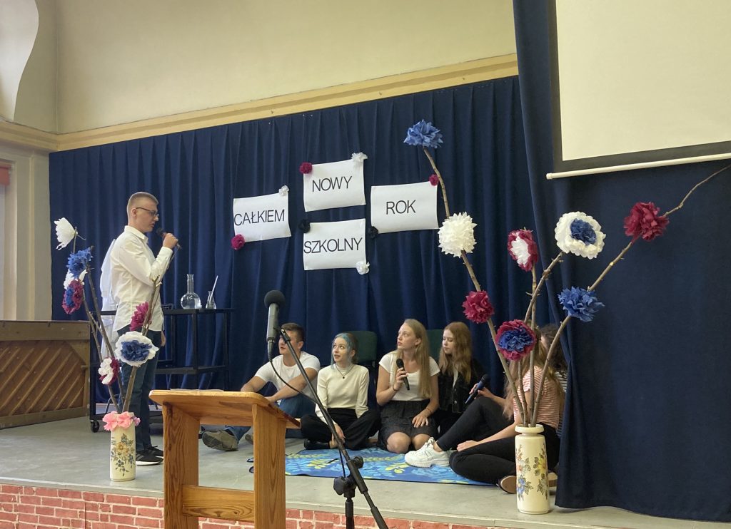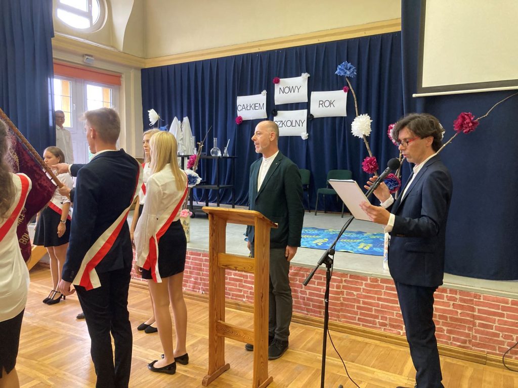 Rozpoczęcie roku szkolnego to zawsze wyjątkowe wydarzenie, ale tegoroczne, poprzedzone kilkumiesięczną nieobecnością uczniów w szkole – było szczególne. 515 licealistów mogło spotkać się z wychowawcami w zespołach klasowych, ale już na akademii obecne były tylko kilkuosobowe reprezentacje poszczególnych klas. W trakcie uroczystości przygotowanej przez klasę II Cp pod opieką wychowawcy, p. Leszka Idzikowskiego nastąpiło przekazanie i ślubowanie nowego Pocztu Sztandarowego. Program artystyczny, tematycznie związany z epidemią – był pochwałą nauki, która jest nadzieją na zwalczenie wirusa.