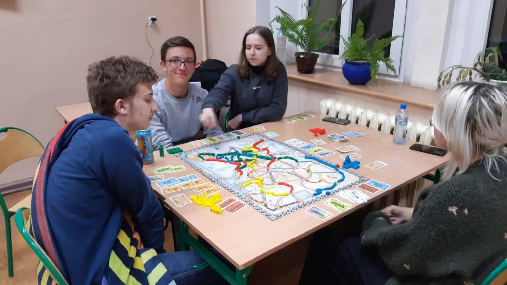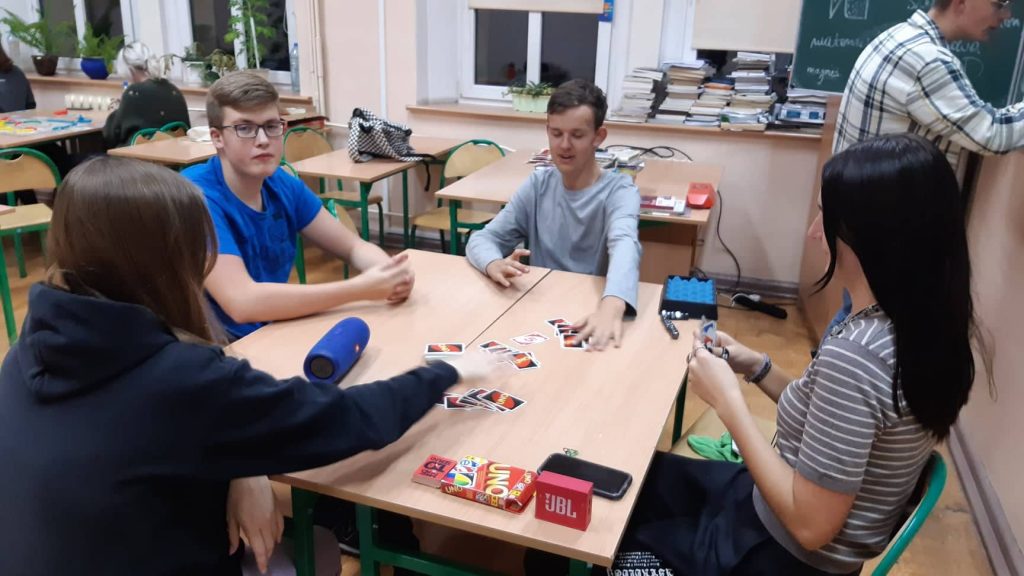 Tak też było w piątkową noc (1 października), kiedy to uczniowie naszej szkoły, zamiast spać, postanowili spędzić czas do sobotniego poranka na rozrywce. Największą popularnością cieszyły się gry towarzyskie, takie jak: Mafia i Wilkołaki, zaś na planszach rozgrywane były przejazdy pociągami, budowanie dróg, walki ze smokami lub po prostu obrona króla na szachownicy. Uno, dos, doble, kent, czyli szybkie gry karciane spowodowały, że czas minął szybko i przyjemnie.