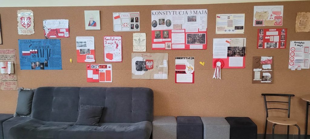 Obchodząc Święto Trzeciego Maja mogliśmy także zapoznać się z ciekawą prezentacją stworzoną przez klasy w trakcie lekcji historii. Na szkolnym korytarzu dominowały biało-czerwone plansze z wieloma cennymi i ciekawymi informacjami.