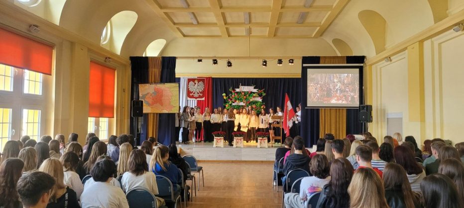 „Mazurek 3 Maja” wybrzmiewał w auli szkolnej kilka razy. Zachęceni występem chóru „Synkopa 2” dołączaliśmy do śpiewu, świętując 28 kwietnia Uroczystość z okazji Święta Narodowego Trzeciego Maja. Członkowie chóru byli nie tylko śpiewakami, ale też przewodnikami po historii wydarzeń z 1791 roku. I tak przypomniano nam najważniejsze zapisy Konstytucji, aby uświadomić jej historyczną rolę. W tle pojawiały się utwory, których wymowa od lat związana jest z poczuciem patriotyzmu i dumy. Nic tak nie podnosi na duchu, jak wspólny śpiew w wykonaniu prawie 500 licealistek i licealistów. Było wzruszająco.
