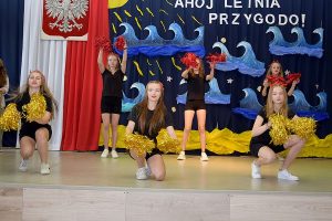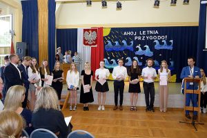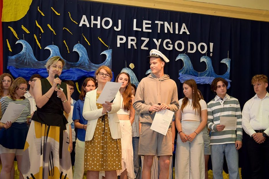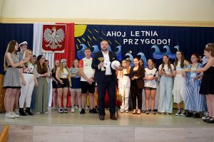 Dyrektor Cezary Czernatowicz podziękował Uczniom i Rodzicom, Gronu Pedagogicznemu, pracownikom administracji i obsługi szkoły oraz Wydziałowi Edukacji w Starostwie za kolejny rok szkolny. Później, wraz z chórem Synkopa 2 oraz klasą I c, która przygotowała uroczystość pod opieką pań Barbary Jusypenko i Irminy Nowak – zabrali nas w podróż „Parostatkiem”, żegnając Bosmana – p. Marcina Sobczyszyna i życząc nam wszystkim wspaniałych wakacji.