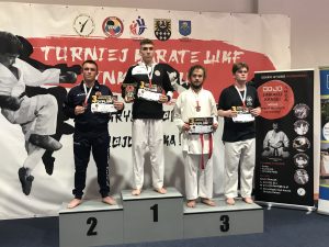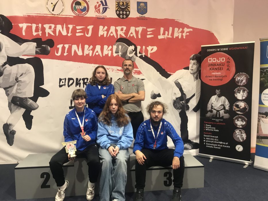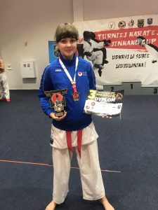 28 października w Trzebnicy odbyła się trzecia edycja Turnieju Karate WKF Jinkaku Cup. W zawodach wzięło udział blisko 400 zawodników z 24 klubów. W turnieju wystartowało również czworo naszych uczniów: Julia Stadnik, Gabriela Ostrowska, Kalina Jankowska oraz Milan Junak przywożąc do Bolesławca dwa medale – złoto i brąz. Julia Stadnik w konkurencji kumite (walka) w kat. dziewcząt -61 kg wywalczyła miejsce I. Milan Junak w konkurencji kumite w kat. chłopców +76 kg wywalczył miejsce III