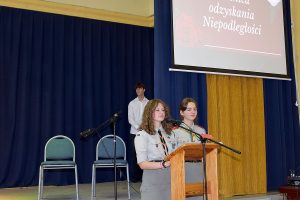 Tegoroczna akademia z okazji Święta Niepodległości odbyła się dwukrotnie, najpierw na auli spotkały się klasy I i IV, następnie klasy II i III. W podniosłej atmosferze stworzonej przez klasę I A wraz z chórem „Synkopa 2” pod wodzą Apolonii Pohl mogliśmy wsłuchać się w patriotyczne pieśni, obejrzeć scenkę przywołującą historyczny moment odzyskania niepodległości w 1918 roku, a także filmowy dokument poświęcony temu wydarzeniu. Nikogo też nie dziwiła „obecność” na scenie marszałka Piłsudskiego.