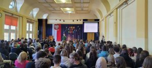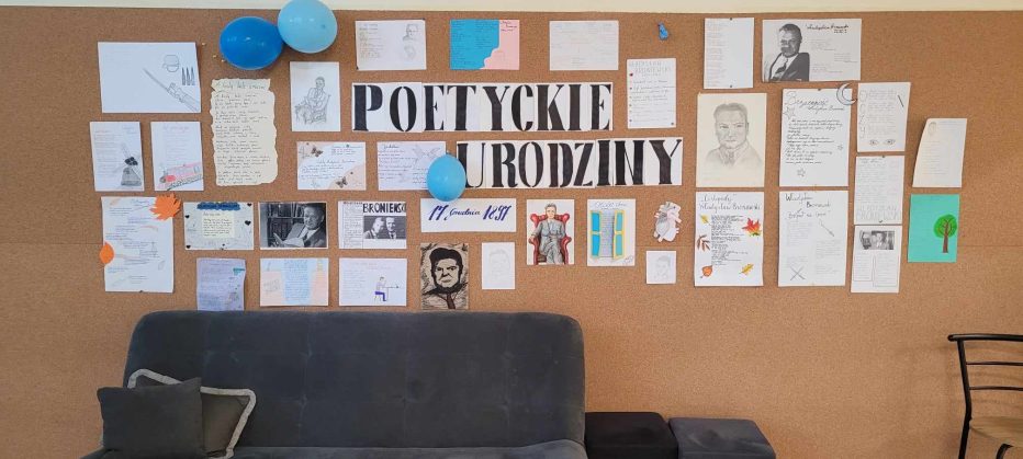 Dziś po raz kolejny świętowaliśmy urodziny naszego Patrona, Władysława Broniewskiego. Poety, człowieka czynu, patrioty, ale też postaci niezwykle skomplikowanej, z tragicznym życiorysem. Urodzony 17 grudnia 1897 roku, świadek i uczestnik wielu historycznych wydarzeń, wychwalany, później „wymazywany” z polskiej literatury – jest przecież poetą niezwykle humanistycznym, dla którego inspiracją była zarówno ojczyzna, jak też miłość, śmierć, ale też wiosna i kwiaty. W przygotowanym spotkaniu z poezją patrona nie zabrakło tych akcentów, ale, co ważne – stały się one powodem dla rozmowy o roli poezji i twórczości w naszym współczesnym życiu. Swoimi doświadczeniami oraz utworami podzielił się z uczniami klas II pan Leszek Idzikowski, który od lat tworzy autorskie piosenki, także te, inspirowane poezją Władysława Broniewskiego. Mogliśmy „podejrzeć” w jaki sposób powstają, kiedy słowo staje się utworem, jak wiersz może brzmieć inaczej, gdy jest zaśpiewany.