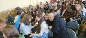 Mogliśmy także sami sprawdzić się w roli twórców w trakcie krótkich warsztatów muzycznych i literackich. Towarzyszyły nam także plastyczne prace pana Leszka Idzikowskiego, inspirowane tekstem i rysunkami z „Małego Księcia”. Zachęt do twórczości w tym dniu było wiele. Szkolny „Chór” zaprezentował „Zielony wiersz” Władysława Broniewskiego, najsłynniejszą w szkole muzyczną wersję skomponowaną przez pana Sławomira Zimniaka, który towarzyszył na scenie wykonawcom. Tym razem klasy pierwsze miały możliwość zapoznać się z tym pięknym tekstem, a nawet go razem wyśpiewać. Na zakończenie Dnia Urodzin przywołaliśmy kolejną, niezwykłą postać – pana Kazimierza Sucharzewskiego, pierwszego absolwenta naszego liceum, nieodżałowanego przyjaciela i entuzjasty naszej szkoły. Także i on pisał wiersze. Wydał wiele tomików, którymi obdarowywał szkolną społeczność. Dziś, na pamiątkę i w dowód wdzięczności za wszystkie lata, w których towarzyszył naszej szkole przywołane zostały w interpretacji czwartoklasistów – Julii, Wiktorii i Mikołaja. Były prezentem od „najstarszych dla najmłodszych”.