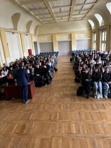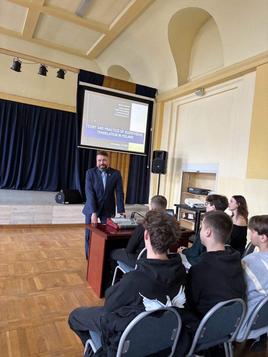 Wszyscy lub prawie wszyscy oglądamy filmy, choć w dzisiejszych czasach często są to seriale, które „przykuwają” naszą uwagę i nas samych do ekranów. Większość z nich to produkcje anglojęzyczne, które są tłumaczone, z lepszym lub gorszym skutkiem. O trudnej sztuce translacji, typowych błędach, ale też sukcesach opowiadał w trakcie swojego spotkania 12 lutego z młodzieżą pan Michał Garcarz,  językoznawca, profesor dr habilitowany nauk humanistycznych, profesor nadzwyczajny Instytutu Filologii Angielskiej Wydziału Filologicznego Uniwersytetu Wrocławskiego. Cieszymy się, że po kilkuletniej przerwie, spowodowanej głownie pandemią profesor Garcarz znów przyjął nasze zaproszenie, bo sam siebie nazywa przyjacielem naszej szkoły i mówi, że zawsze chętnie do nas przyjeżdża z wykładem lub warsztatami (na które niedługo liczymy). Tym razem był to wykład o przekładzie w filmach, a biorący w nim udział uczniowie z różnych klas 1-4 na koniec mogli zadać nurtujące ich pytania. Organizatorką spotkania była pani Katarzyna Cieślak-Ostrowska.