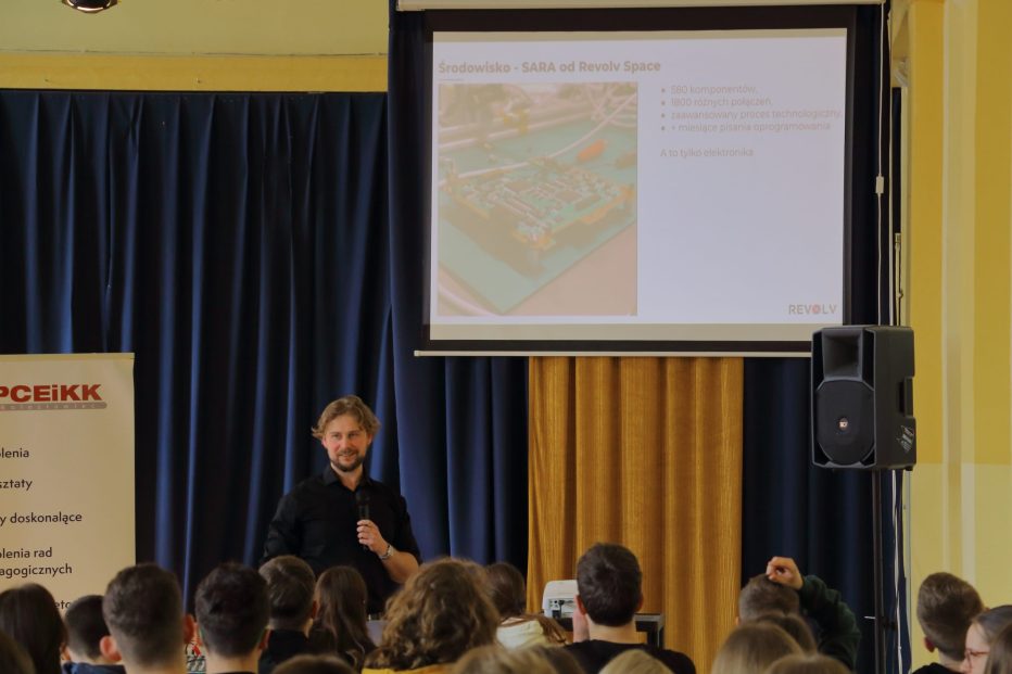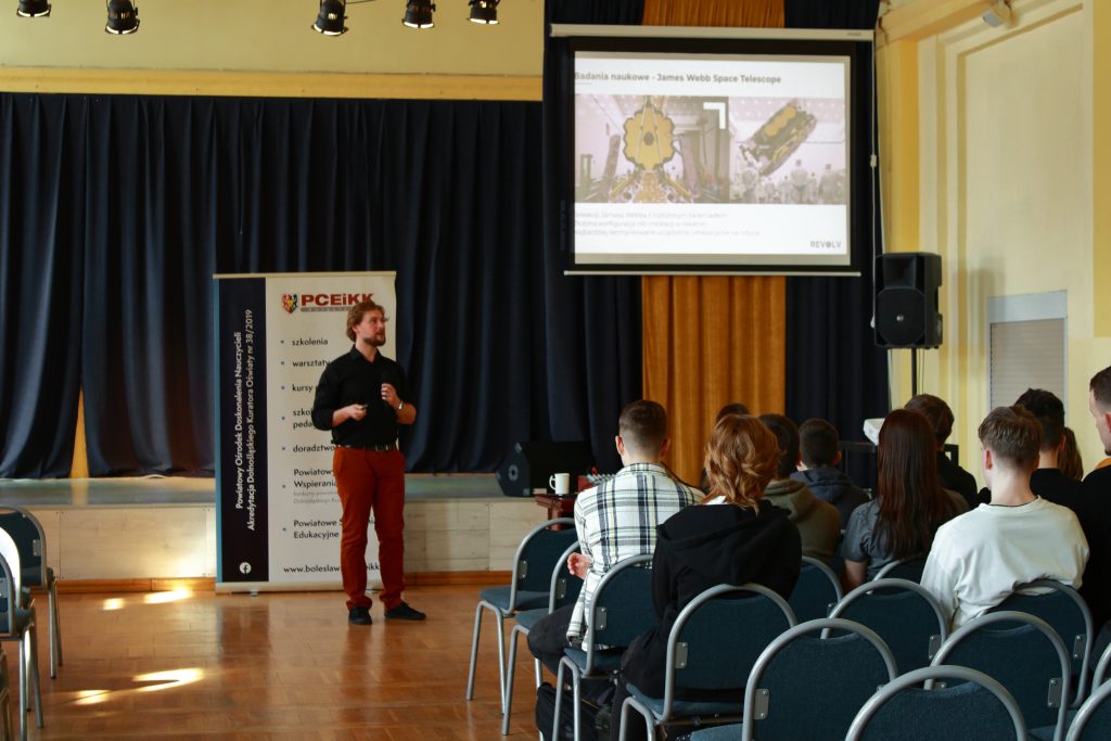 11 marca nauczyciele i uczniowie bolesławieckich szkół ponadpodstawowych spotkali się w naszej auli, gdzie mieli okazję wysłuchać wykładu „TECHNOLOGIE KOSMICZNE”, wygłoszonego przez pana Sławomira Małkowskiego, absolwent naszego liceum, a obecnie kierownik systemów wbudowanych w holendersko – włoskiej firmie Revolv Space współpracującej z Europejską Agencją Kosmiczną (ESA). Na spotkaniu zorganizowanym przez Powiatowe Centrum Edukacji i Kształcenia Kadr i metodyka fizyki, pana Zdzisława Zarzyckiego uczestnicy mogli zapoznać się z tematem sztucznych satelitów, ich założeniami projektowymi, testami, ich produkcją, aż do finalnego umieszczenia ich na orbicie. Pan Małkowski dużo uwagi poświęcił zastosowaniu satelitów, komunikacji satelitarnej oraz prowadzeniu badań naukowych. Uczniowie po wykładzie mieli możliwość dyskusji na temat konkretnych rozwiązań, jak i możliwości podjęcia w przyszłości pracy w tej branży.