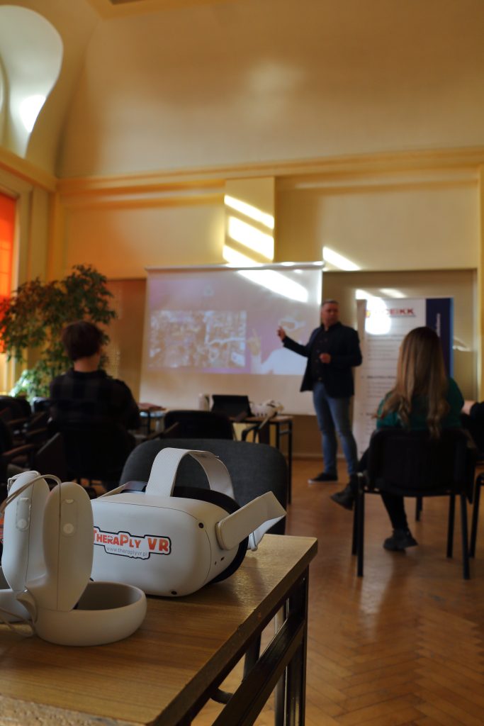 W drugiej części spotkania odbyły się warsztaty VR pt. „Aleee kosmos!” prowadzone przez pana Macieja Pronkiewicza, doradcę informatyki w PCEiKK. Celem warsztatów było zaprezentowanie praktycznego i profesjonalnego wykorzystania wirtualnej rzeczywistości w technologiach kosmicznych. Podczas spotkania uczestnicy mieli możliwość zobaczenia jak rozwiązania firmy HTC, jednego z wiodących producentów zestawów VR, wspierają kosmonautów na Międzynarodowej Stacji Kosmicznej (ISS) oraz stanowią narzędzie uzupełniające ich przygotowania do realizacji misji w przestrzeni kosmicznej. Oczywiście najciekawszą częścią warsztatów było wirtualne przeniesienie grupy uczniów na Międzynarodową Stację Kosmiczną oraz „posmakowanie” przez nich uczucia stanu nieważkości poza stacją kosmiczną.