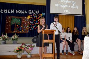 Prowadzący uroczystość: Oliwia Parpura i Michał Raszczuk z kl. I e