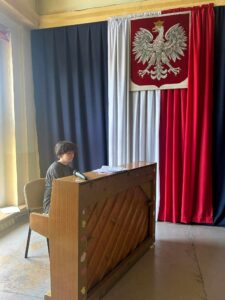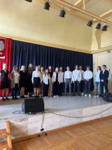 W nawiązaniu do historii współczesnej – uczniowie podjęli próbę wspólnego śpiewania i w ten sposób przenieśliśmy się w inne, radosne wydarzenie, które uczciliśmy „Odą do radości”, czyli hymnem Unii Europejskiej. Na zakończenie wystąpili ; Apolonia Pohl i pan profesor Sławomir Zimniak, w których wykonaniu usłyszeliśmy utwór pt „Czerwony autobus”. Historia kołem się toczy, dzięki piosenkom można się jej uczyć, utrwalać.