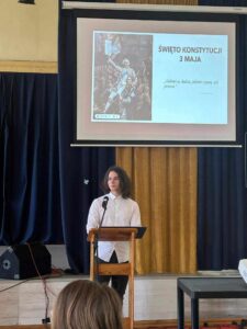 30 kwietnia społeczność naszej szkoły zebrała się w auli, aby celebrować święta majowe i uczcić 20 – letnią obecność Polski w Unii Europejskiej. Odśpiewany wspólnie Hymn wprowadził nas w uroczysty charakter spotkania, podobnie jak prezentacja o „Konstytucji 3 Maja”, którą przygotowała Natasza Mastalska, a przedstawił Kamil Gałka, uczniowie klasy 3b. Wystąpienie muzycznie wzbogacili: chór szkolny „Synkopa II”, prezentując pieśń pt. „Witaj majowa jutrzenko”, a także Berenika Stelmaszek z klasy 3a, która zaprezentowała utwór F. Szopena.