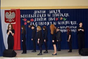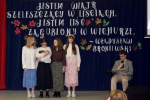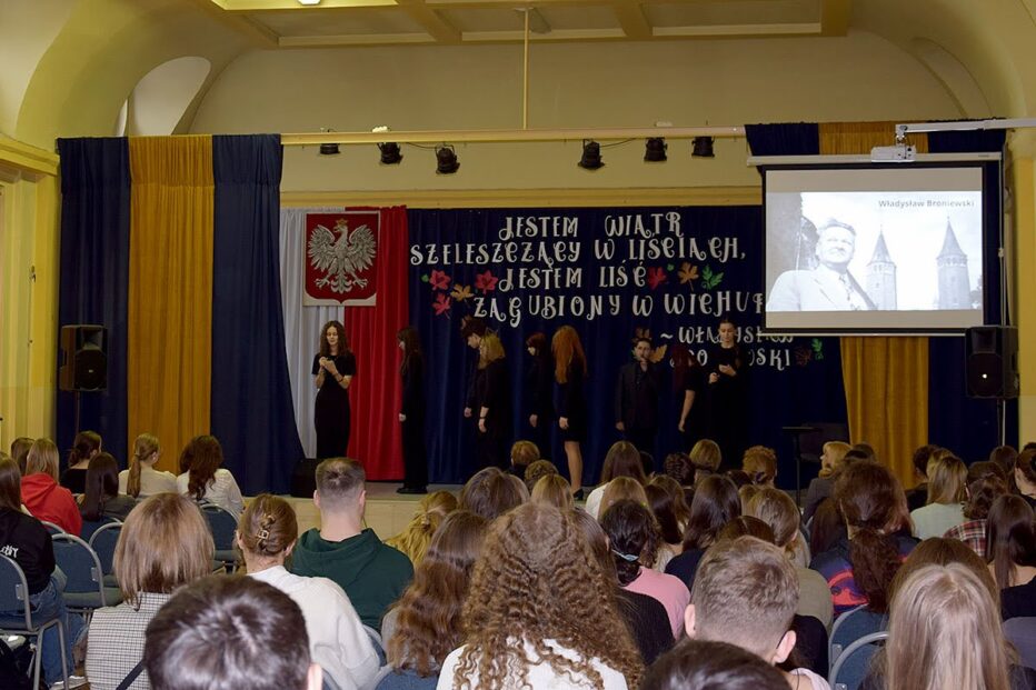 W auli czekał na nas montaż słowno-muzyczny, poświęcony zarówno życiu Władysława Broniewskiego, jak też temu ważnemu okresowi twórczości, który wywołany został tragiczną śmiercią córki Anki (zmarła w 1954 r.). Piękne, choć mocno depresyjne wiersze oddające ból i cierpienie po utracie – porównywane są do trenów Kochanowskiego, a w interpretacji pierwszoklasistów wybrzmiały niezwykle wzruszająco. Na scenie zobaczyliśmy także samego poetę i jego rodzinę, a także wojenne epizody. Tu role odegrali drugoklasiści.