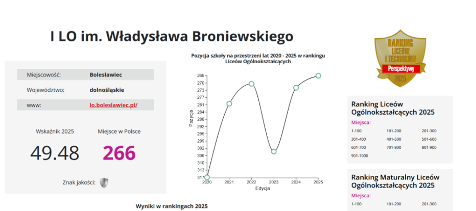 Na sukces, którym jest awans na pozycję 266 w Polsce oraz 18 miejsce na Dolnym Śląsku zapracował rocznik absolwentów 2024, który uzyskał wysokie wyniki egzaminu maturalnego (zdanego w 100%), w tym z przedmiotów rozszerzonych! Gratulujemy!
