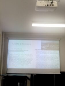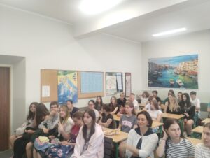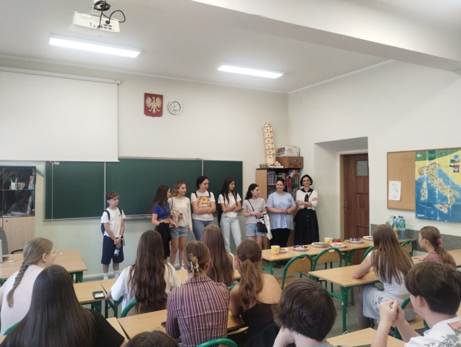 Giorgia przypomniała nam najważniejsze informacje o patronce naszego miasta, Świętej Marii De Mattias, która to właśnie w Acuto założyła Zgromadzenie Sióstr Adoratorek Krwi Chrystusa. Federica i Veronica opowiadały o uroczystościach i festynach organizowanych w Acuto, między innymi o SalTaranta – festiwalu muzyki i tańca, o Świętym Maurycym – patronie miasta, z którego pochodzą, ale także o święcie makaronu, żywej szopce i Bożym Ciele. Prezentacja była niezwykle interesująca, bogata w informacje i wzbogacona o wizualizacje, które pozwoliły lepiej zrozumieć dziedzictwo kulturowe Włoch. Po zakończeniu części oficjalnej, odbył się drobny poczęstunek, który stworzył okazję do integracji między uczniami.
