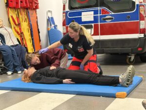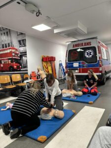 W kolejnej części warsztatów ćwiczyliśmy nasze umiejętności wykonywania resuscytacji krążeniowo-oddechowej. Panie instruktorki pokazały nam prawidłowe ułożenie rąk, rytm uciśnięć oraz jak zachować się w sytuacji, gdy ktoś straci przytomność.