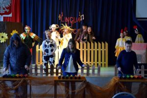 Niezwykle wzruszającym akcentem był teatralny występ gości z Zespołu Szkół i Placówek Specjalnych, który zaprezentował szkolnej publiczności mini sztukę „Na wiejskim podwórku”. Aktorzy i muzycy prowadzeni przez panią Dorotę Kowalską zagrali z takim zaangażowaniem, że otrzymali owacje na stojąco i ogromne gratulacje za swój występ. Pięknie dziękujemy i życzymy dalszych sukcesów scenicznych.