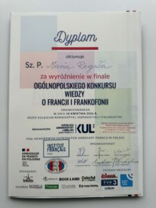 Z dumą informujemy, że Maria Reguła, uczennica klasy IVa i pasjonatka języka francuskiego, po raz kolejny znalazła się w finale Ogólnopolskiego Konkursu Wiedzy o Francji i Frankofonii. Konkurs organizowany przez Wydział Romanistyki KUL w Lublinie zgromadził ponad 250 licealistów z całej Polski. Uczestnicy zmierzyli się z wymagającymi pytaniami z zakresu geografii, historii, kultury, polityki oraz współczesności Francji i krajów frankofońskich. Marysia znalazła się w gronie 10 wyróżnionych osób.