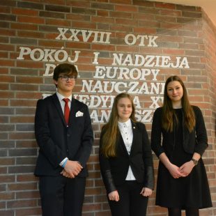Podopieczna księdza doktora Tomasza Krauze – Julia Rajczakowska z klasy II d może być dumna z osiągnięcia I miejsca na etapie diecezjalnym XXXIV Olimpiady Teologii Katolickiej. 10 stycznia do zawodów w Centrum Spotkań im. Jana Pawła II w Legnicy pod tegorocznym hasłem: „Zasady społeczne w nauczaniu Kościoła” stanęło 52 uczniów z 25 szkół ponadpodstawowych znajdujących ..